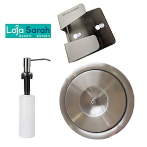 Kit Lixeira Embutir tampa escovada 3l + Dosador + Porta Esponja Em Inox 304Kit Médio de embutirLixeira 3L tampa inox Escovada + Dosador + Porta esponja em inox 304Componentes do kit; 1 Lixeira em inox 3 litros 15cm diametro x 25cm altura 1 Dosador de detergente 500ml capacidade 1 Suporte p/ esponja com ventosa em inox