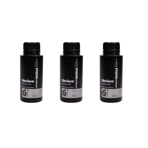 Vita Derm Intensiv Color Fashion Locao Reveladora 6 Vol 90ml Loção Reveladora 6 Vol. Vita Derm Intensiv Color Fashion e indicada para cabelos que vao passar por processos químicos de Transformacão de cor. Trata e protege os fios durante o processo. A Loção Reveladora Vita Derm Intensiv Color Fashion 6 Vol foi desenvolvida para ser utilizada na preparação De colorações e descolorações ou na tonalizacao. A emulsão cremosa e de alta rentabilidade e revela de 2 a 3 tons. Conselho de Aplicação Siga atentamente as instruções na embalagem do produto e na bula da coloração. Adicione a quantidade Indicada, conforme o procedimento a ser utilizado. Observações: Recomendamos que este produto seja apenas por profissionais; Gestantes e lactantes devem consultar seu médico antes de fazer o uso; Não deve ser aplicado em menores de 15 anos; Indicamos a realização de um teste de toque e de mecha antes do início do procedimento; Em caso de irritação ou ferida pré-existente no couro cabeludo, consulte um médico antes da aplicação; Utilize uma luva descartável no momento da aplicação. Dica O teste de toque e muito importante antes do procedimento para evitar alergias na pele, coceira ou Ardencia no local. Resultado Com alta rentabilidade promove perfeita revelacão de piamentos. Marca: Não Informado
