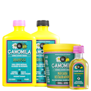 Kit com shampoo, condicionador, máscara e óleo capilar. Lola Cosmetics Camomila é indicado para cuidar e tratar os cabelos loiros.