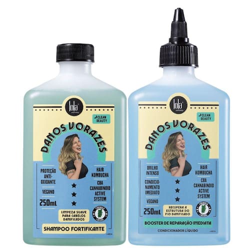 Kit com shampoo e condicionador para cabelos danificados. Lola Cosmetics Danos Vorazes Duo oferece cuidado diário de reparação aos danos e revitalização dos fios.