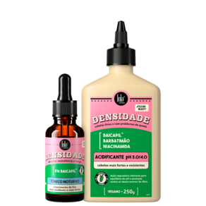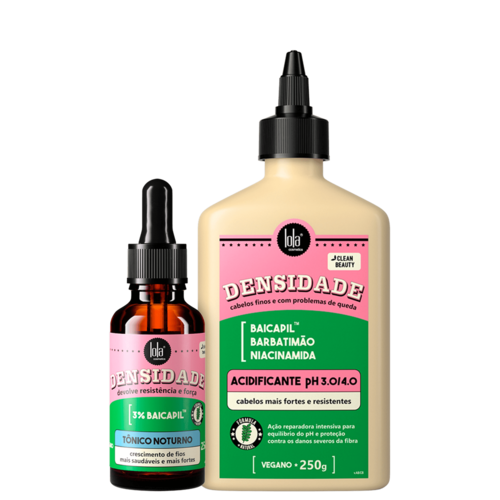 Kit com acidificante e tônico capilar para cabelos finos e com problemas de queda. Lola Cosmetics Densidade Duo auxilia no crescimento dos fios.