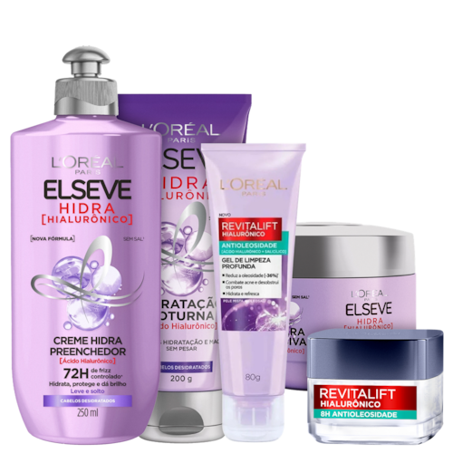 Kit de cuidados com a pele e cabelo. L'Oréal Paris Revitalift Elseve Hidra é ideal para seu ritual diário cuidados com os fios e com o rosto.