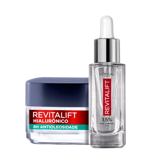 Kit com sérum anti-idade e gel preenchedor. L'Oréal Paris Revitalift Peles Mistas e Oleosas possui ação anti-idade e antioleosidade, hidratando e reduzindo os poros.