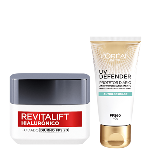 Kit com creme Redutor de Linhas e protetor solar facial. Kit L'Oréal Paris UV Defender & Hialurônico protege contra os raios solares e reduz linhas finas. Além de hidratar a pele por até 24h e promover aspecto juvenil.