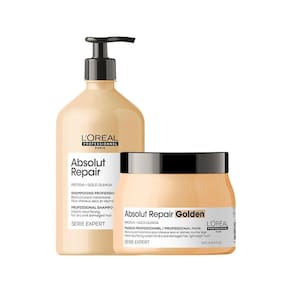 A linha de tratamento L'Oréal Professionnel Serie Expert Gold Quinoa é indicada para cabelos muito danificados. Sua fórmula enriquecida auxilia na profunda reestruturação da fibra danificada enquanto criam um filme que promove força e proteção aos fios, prevenindo danos futuros. Tudo isso com muita maleabilidade, maciez, brilho, sem rigidez e sem pesar os fios. Esta fórmula possui uma tecnologia exclusiva da LOréal Professionnel, a Co-Emulsão. Repare seu cabelo com a L'Oréal Professionnel Serie Expert Gold Quinoa Resultado:multifuncional SUGESTÃO DE USO:Shampoo1. Aplique o shampoo sobre o cabelo molhado;2. Massageie com suavidade;3. Enxágue e, se necessário, repita o processo.Máscara1. Aplicar no cabelo lavado e úmido;2. Deixar agir por 3 a 5 minutos;3. Enxaguar Observações:imagem Meramente Ilustrativa.Itens Inclusos:1 Shampoo L'Oréal Professionnel Serie Expert Absolut Repair Gold Quinoa 750 ml1 Máscara de Reparação L'Oréal Professionnel Serie Expert Absolut Repair Gold Quinoa Golden 500 g