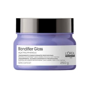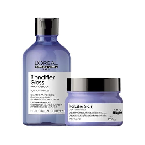 A Linha L'Oréal Professionnel Blondifier foi criada para cabelos loiros, descoloridos ou com mechas.Sua formula traz ativos antioxidantes, ideais para proteger o cabelo dos danos causados pela descoloração e as agressões do dia a dia. Nutre e equilibra o pH, com mais maciez e luminosidade.Com o Kit L'oréal Professionnel Serie Expert Blondifier você repara a fibra capilar e mantém a cor Resultado:cuidado dos LoirosNutrição SUGESTÃO DE USO:Shampoo1. Distribuir uniformemente por todo o cabelo molhado e fazer espuma;2. Enxaguar completamente.Máscara1. Aplicar no cabelo lavado e úmido;2. Deixar agir por 3 a 5 minutos;3. Enxaguar. Observações:imagem Meramente Ilustrativa. ITENS INCLUSOS:1 Shampoo L'Oréal Professionnel Serie Expert Blondifier Gloss 300 ml1 Máscara de Matização L'Oréal Professionnel Serie Expert Blondifier Cool 250 g Ean: 1008597847670