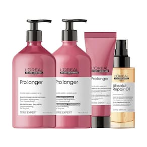 A Linha Serie Expert Pro Longer da L'Oréal Professionnel foi criada para cabelos longos com pontas afinadas ou danificadas. Tratamento preenchedor de pontas para um cabelo mais longo, denso e com brilho.Sua tecnologia de preenchimento Filler-A100 que faz com que o produto penetre no núcleo da fibra capilar para preencher e densificar a estrutura do cabelo por dentro enquanto os aminoácidos trabalham para fortalecer o cabelo pelo lado de fora.Com o Kit L'Oréal Professionnel Serie Expert Pro Longer conquistar o cabelo longo vai ser uma realidade Resultado: força. SUGESTÕES DE USO: ShampooAplique o shampoo sobre o cabelo molhado;Massageie com suavidade;Enxágue e, se necessário, repita o processo. condicionadoraplique o condicionador no comprimento e pontas do cabelo;Deixe agir por mais o menos 3 minutos;Finalize enxaguando. leave-inaplicar após lavagem do cabelo;Distribua o creme nos fios úmidos ou previamente secos antes de usar o secador, prancha e/ou modelador. óleoaplique uma pequena quantidade do sérum no cabelo seco;Espalhe uniformemente pelos comprimentos e pontas médias e não enxágue;Finalize como desejar. Observações: imagem Meramente Ilustrativa ITENS INCLUSOS: 1 L'Oréal Professionnel Serie Expert Pro Longer Shampoo 300ml1 L'Oréal Professionnel Serie Expert Pro Longer Condicionador 200ml1 L'Oréal Professionnel Serie Expert Pro Longer Leave-in 150ml1 L'Oréal Professionnel Serie Expert Absolut Repair Gold Quinoa Protein 10 in 1 Óleo Capilar 90ml