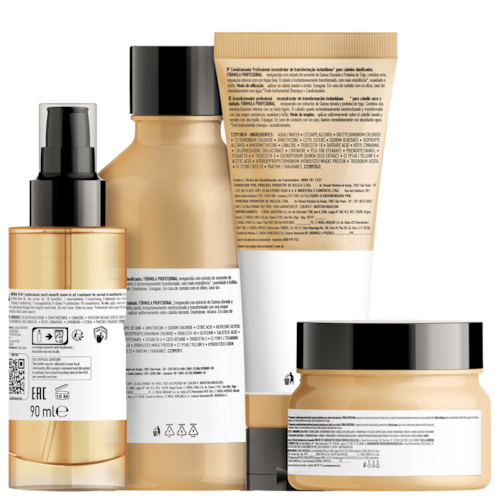 Kit com shampoo, condicionador, máscara capilar e óleo. L'Oréal Professionnel Serie Expert Absolut Repair Gold Quinoa + Protein Quarteto sela as cutículas, retendo a hidratação dentro da fibra.