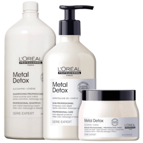 Kit L'Oréal Professionnel Metal Detox Trio com shampoo, máscara hidratante e tratamento capilar. Indicado para cabelos coloridos ou com mechas.