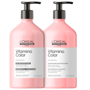 Kit de tratamento para cabelos coloridos. L’Oréal Professionnel Serie Expert Vitamino Color traz shampoo e condicionador formulados com Resveratrol e agentes antioxidantes.