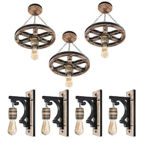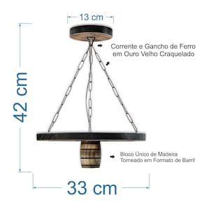Kit luminárias rústicas coloniais em madeira maciça 4 lustres pendentes modelo roda de carroça - 33cm de diâmetro 3 arandelas coloniais modelo barril