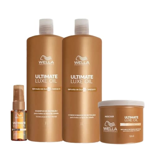 Wella Professionals Ultimate Luxe Oil - Shampoo 1L: para todos os tipos de cabelo, remove o metal e as impurezas acumuladas nos fios. Enriquecido com óleo de argan, amêndoas e jojoba, possui propriedades nutritivas e hidratantes, juntamente com o Ômega-9 para proteção externa dos fios. Pensada para nutrir e proteger os cabelos de dentro para fora.