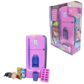 O kit vem com fogão com panelas, geladeira com comidinhas, mercadinho completo, kit louça com escorredor