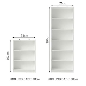 Medidas totais de estante menor: 102 cm de altura x 71 cm largura x 30 cm de profundidade.