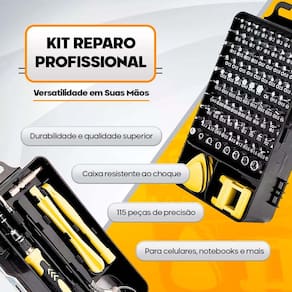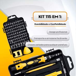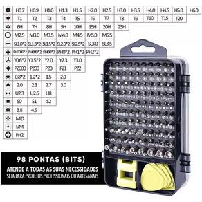 Esse kit conta com uma chave multifunção que em conjunto com seus 98 BITS, pode ser uma chave, torx, torx com furo, phillips, fenda, pozidriv, Pentabole, allen, MID, SIM, agulha, estrela – 5 pontas, triangular, U, Y, soquete, canhão, hexagonal, pentagonal, quadrada, PH, SL, Sextavado, Tri-wing, Robertson, Spanner e etc.