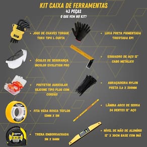 Conjunto completo com 43 peças de ferramentas e equipamentos de proteção individual.