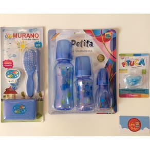 Tudo que seu bebê precisa para o nascimento, um kit com 3 mamadeiras para diversas ocasiões, com uma chupeta pequena para recém nascidos e por ultimo um kit super prático com pente, saboneteira e prendedor de chupeta