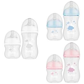 O kit inclui 2 mamadeiras com capacidade de 120ml e 270ml e bicos fluxo tamanhos 1 e 2.