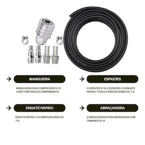 O kit completo para suas necessidades de conexão de ar comprimido Este conjunto prático inclui todos os componentes essenciais para garantir uma conexão segura e eficiente em seu sistema de ar comprimido. conteúdo do Kit: 1x Engate Rápido para Ar 1/4 com Rosca Fêmea 1/4: Facilita a conexão e desconexão rápida e segura das ferramentas pneumáticas, garantindo maior agilidade em suas atividades. 1x Pino Conector 1/4 x Rosca Fêmea 1/4: Ideal para conexões precisas, proporcionando uma vedação perfeita e sem vazamentos. 1x Pino Conector 1/4 x Rosca Macho 1/4: Versátil e resistente, é compatível com diversas ferramentas e acessórios pneumáticos. 1x Espigão M. FX 1/4 NPT x Mangueira 5/16: Perfeito para adaptar a mangueira ao sistema de ar, garantindo uma conexão firme e segura.