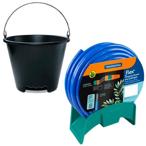 A Mangueira Flex Tramontina Azul em PVC 2 Camadas 20 m com Engates Rosqueados, Esguicho e Suporte mural é ideal para ter mais praticidade na hora de cuidar do jardim.