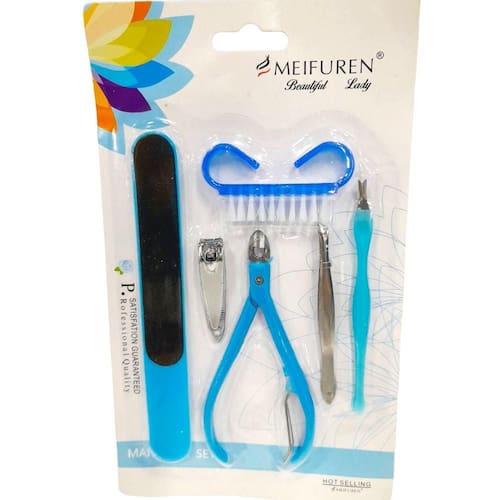 01 lixa, escova, 01 cortador de unha, 01 alicate de cutícula, 01 pinça e 01 aparador de cutícula.