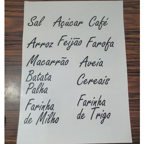 Cartela com 12 Etiquetas Resistentes água. Nomes dos Mantimentos que vem na cartela: -açúcar -arroz -aveia -batata Palha -café -cereais -farofa -farinha de Milho -farinha de Trigo -feijão -macarrão -sal