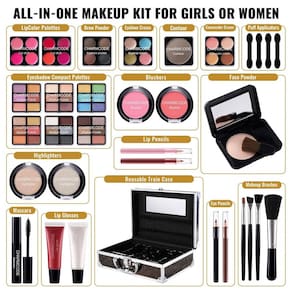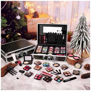 Componentes Incluídos 2 lápis olhos, 2 lápis lábios, 1 máscara, 1 pó facial, 4 puffs, 4 pincéis, 6 paletas sombras, 2 blushes, 2 iluminadores, 1 contorno, 2 paletas labiais, 1 pó sobrancelhas, 1 sombra cremosa, 1 corretivo cremoso, 2 gels labial, estojo alumínio com espelho