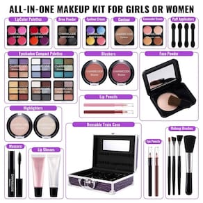 Componentes Incluídos 2 lápis olhos, 2 lápis lábios, 1 máscara, 1 pó facial, 4 puffs, 4 pincéis, 6 paletas sombras, 2 blushes, 2 iluminadores, 1 contorno, 2 paletas labiais, 1 pó sobrancelhas, 1 sombra cremosa, 1 corretivo cremoso, 2 gels labial, estojo alumínio com espelho