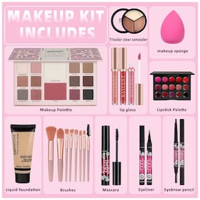 Kit maquiagem tudo em um KAVCENT com paleta multifuncional, gloss labial, paleta de batom, foundation líquida, corretivo, máscara, lápis para sobrancelhas, delineador, puff de pó e conjunto de pincéis para aplicação completa em rosto, olhos e lábios.