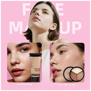 Componentes incluem fórmulas líquidas para base e corretivo com cobertura em camadas, pigmentos em paletas para versatilidade tonal, puff para difusão uniforme de pós e pincéis para contornos precisos. Estrutura modular para configurações variadas de maquiagem.