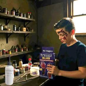 Kit slug + latex liquido ideal para criar efeitos de feridas, cortes, queimaduras ou hematomas. Pode ser em festas, peças teatrais, maquiagem artística e também para cobertura de tatuagens e ilusionismo. Rende de 10 a 15 feridas pequenas. Fácil de aplicar e remover. O kit de maquiagem de terror slug contém: Massa mágica slug 50gr; Sangue preto artificial para queimadura 10ml; Sangue vermelho artificial para feridas 10ml; Espátula para aplicação da maquiagem; Instruções de uso. Produto não comestível: A massa, o sangue e a queimadura são 90% naturais, a base de talco, amido de trigo e glicerina. Contém hidratante e filtro solar. Você pode caminhar no sol sem nenhum tipo de preocupação em relação a reação alérgica, pois o produto não contém nenhum tipo de cola ou amônia. Aconselhamos usar em crianças acima de 07 anos de idade e com o auxílio de um adulto para evitar ingestão acidental. Seca em aproximadamente 20 minutos dependendo da espessura da maquiagem. Permanece por 4 a 5 horas na pele podendo variar de acordo com o clima, temperatura e ambiente. Remover com água e sabão. Látex bi centrifugado pré vulcanizado Utilizado geralmente no auxílio para impermeabilizar a maquiagem/massa, proporcionando cenas externas na chuva, mergulho, etc... Também para prolongar a duração da mesma. Aconselha-se que este produto seja utilizado por , pois requer muitos cuidados . O produto possui cheiro um pouco forte em seu estado líquido. Quando seca também permanece um cheiro de borracha. Obs: cuidado ao fazer uso do látex perto de tecidos e ou roupas, pois ele danifica e não sai mais. Recomenda-se fazer um teste de alergia antes do uso do látex, pois ele possui amonia em sua composição. Kit maquiagem de terror Maquiagem sangue fake Maquiagem queimadura fake Massa de maquiagem Maquiagem hidrossolúvel Maquiagem para cosplay Maquiagem de filme de terror Efeito de ferida Maquiagem assustadora Maquiagem especial para halloween Efeitos especiais de maquiagem Maquiagem de alta realismo Kit maquiagem artística Maquiagem de terror Fantasia com efeitos especiais Maquiagem para festas temáticas Maquiagem para teatro e cinema Produtos para efeitos de ferida Marca: Não Informado