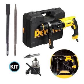 Kit Martelete Perfurador Rompedor D25133K Dewalt 220v + Mandril Adaptador + Talhadeira + Ponteiro Martelete Rotativo Rompedor Dewalt D25133k-B2 220v : Ideal para furos em Alvenaria e Concreto e trabalhos de pequenas demolições. Leve, compacto e ergonômico; Velocidade variável e reversível; Ajuste rápido de profundidade da perfuração. CARACTERÍSTICAS: Potência: 800 W Energia de Impacto EPTA 05/2009 : 2,6 Joules Impactos por Minuto: 0-5.500 IPM Velocidade sem Carga: 0-1.500 RPM Encaixe SDS Plus Função Modo Perfurador com Impacto, sem Impacto e Rompedor Capacidade em Concreto: 26 mm Capacidade em Madeira: 30 mm Capacidade em Aço 13 mm Diâmetro máximo para uso eventual: 32mm, Diâmetro máximo para uso contínuo: 26mm. Peso: 2,6 Kg Mandril 13 mm. Com Chave + 01 Adaptador SDS Mandril com Chave 13 mm., indicado para furadeiras do tipo engate SDS Ideal para furação em Metal e Maderia com brocas Paralelas Características: Medida: 13 mm; Composição: Aço carbono 45. Talhadeira SDS Plus 250mm Talhadeira 250 x 14 x 20 mm para marteletes com encaixe SDS Plus. Acompanha embalagem plástica para armazenagem e transporte. Dimensões 14 x 20 x 250mm Largura da pá 20mm Comprimento 250mm Ponteiro SDS Plus 14 x 250mm O Ponteiro SDS Plus feito de aço 40X, é no modo de bater sem fazer girar, para desmontagem de concreto com armadura, perfuração de furos e ranhuras em concreto Especificações Técnicas: Comprimento do Produto: 250x14mm Encaixe: SDS PLUS Características: Aço 40X Haste SDS-Plus Conteúdo: 01 - Martelete Rotativo Rompedor Dewalt D25133k-B2; 01 - Empunhadura Lateral; 01 - Limitador de Profundidade; 01 - Talhadeira SDS Plus 250mm 01 - Ponteiro SDS Plus 14 x 250mm 01 - Mandril 13 mm; 01 - Chave Mandril; 01 - Adaptador SDS; 01 - Maleta. Imagem Meramente Ilustrativa Marca: Não Informado
