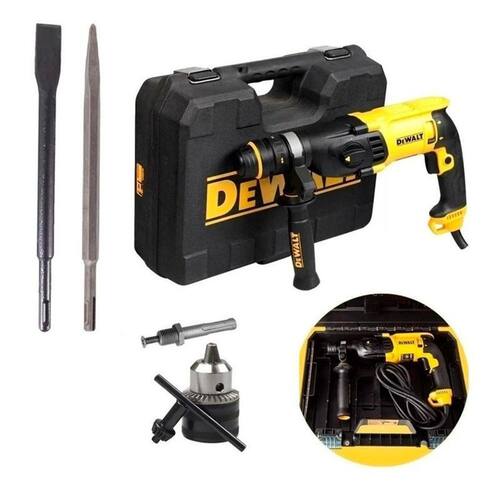 Kit Martelete Perfurador Rompedor D25133K Dewalt 220v + Mandril Adaptador + Talhadeira + Ponteiro Martelete Rotativo Rompedor Dewalt D25133k-B2 220v : Ideal para furos em Alvenaria e Concreto e trabalhos de pequenas demolições. Leve, compacto e ergonômico; Velocidade variável e reversível; Ajuste rápido de profundidade da perfuração. CARACTERÍSTICAS: Potência: 800 W Energia de Impacto EPTA 05/2009 : 2,6 Joules Impactos por Minuto: 0-5.500 IPM Velocidade sem Carga: 0-1.500 RPM Encaixe SDS Plus Função Modo Perfurador com Impacto, sem Impacto e Rompedor Capacidade em Concreto: 26 mm Capacidade em Madeira: 30 mm Capacidade em Aço 13 mm Diâmetro máximo para uso eventual: 32mm, Diâmetro máximo para uso contínuo: 26mm. Peso: 2,6 Kg Mandril 13 mm. Com Chave + 01 Adaptador SDS Mandril com Chave 13 mm., indicado para furadeiras do tipo engate SDS Ideal para furação em Metal e Maderia com brocas Paralelas Características: Medida: 13 mm; Composição: Aço carbono 45. Talhadeira SDS Plus 250mm Talhadeira 250 x 14 x 20 mm para marteletes com encaixe SDS Plus. Acompanha embalagem plástica para armazenagem e transporte. Dimensões 14 x 20 x 250mm Largura da pá 20mm Comprimento 250mm Ponteiro SDS Plus 14 x 250mm O Ponteiro SDS Plus feito de aço 40X, é no modo de bater sem fazer girar, para desmontagem de concreto com armadura, perfuração de furos e ranhuras em concreto Especificações Técnicas: Comprimento do Produto: 250x14mm Encaixe: SDS PLUS Características: Aço 40X Haste SDS-Plus Conteúdo: 01 - Martelete Rotativo Rompedor Dewalt D25133k-B2; 01 - Empunhadura Lateral; 01 - Limitador de Profundidade; 01 - Talhadeira SDS Plus 250mm 01 - Ponteiro SDS Plus 14 x 250mm 01 - Mandril 13 mm; 01 - Chave Mandril; 01 - Adaptador SDS; 01 - Maleta. Imagem Meramente Ilustrativa