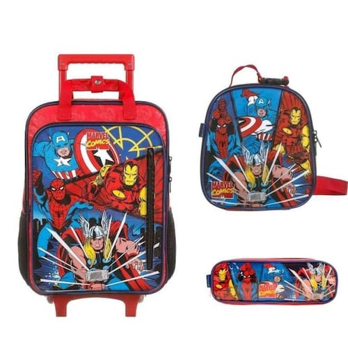 Kit Marvel Comics Mochilete + Lancheira + Estojo Duplo A Mala Escolar G com Rodinhas Marvel Comics com estampa divertida dos personagens, possui design prático para ser usada no dia a dia em diversas atividades. O carrinho de haste única em alumínio torna a peça mais leve e resistente. As rodinhas possuem sistema de rodízio que fornece segurança e leveza no transporte. Produto versátil que pode ser levado à escola, passeios, shoppings, parques, entre outros.Dimensõesaltura: 45,00 cmLargura: 30,00 cmProfundidade: 3,00 cmPeso: 0,734 kg Lancheira Marvel Comics 11675 DMWA hora do lanchinho fica mais gostosa com a Lancheira Escolar Infantil DMW Marvel Avengers. Completa, acompanha squeeze e pote para organizar e manter a temperatura dos alimentos. O design cheio de atitude, se inspira nos heróis favoritos dos meninos. Aproveite Estojo Soft 2 Divisões Marvel Comics Masculino Super 11674 - DMW