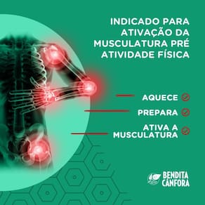 Kit massagem bendita cânfora: ative + relaxante O kit massagem bendita cânfora é um grande aliado no alívio de dores, tensões dos músculos e articulações. O gel ative, aquece, prepara e ativa a musculatura antes da pratica de atividades físicas. Já o gel relaxante, massageia e relaxa a musculatura no após. Essa duplinha ajuda a tornar a prática de atividades físicas mais confortável e relaxante. Maldita dor, bendita cânfora Marca: Bendita Cânfora