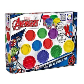 Conteúdo do kit: massinhas coloridas, moldes de carimbos dos personagens dos Avengers.