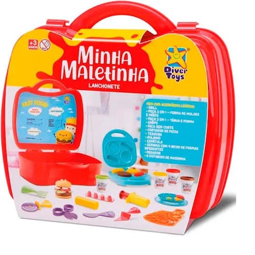 Kit Massinha de Modelar - Diver Massa - Lanchonete - Divertoys: as crianças vão se divertir de montão brincando de gerenciar sua própria lanchonete. O brinquedo Minha Maletinha Lanchonete vem com diversos acessórios para fazer comidinhas incríveis! A maletinha tem diversos utensílios usados numa cozinha de verdade. Tudo isso pode ser levado em uma linda maletinha resistente e funcional. Tudo o que as crianças precisam para brincar de comidinha está na Minha Maleta Lanchonete com acessórios da Divertoys. Informações: • Produto: Minha Maletinha Lanchonete • Marca: Divertoys • Coleção: Minha Maletinha Dino • Tipo: Conjunto com Maleta e Massinha de Modelar • Categoria: Artes e Atividades • Conteúdo: - 01 Grill - 02 peças 2 em 1 - 04 potinhos de massa com 50g cada - Garfo - Faca - Tesoura sem corte - Cortador de pizza - Rolinho - Espátula - Seringa - Pegador • Recomendação: para crianças a partir de 03 anos de idade Especificações: • Referência: 8151 • Código de Barras: 7898639381514 • Embalagem (C x A x L): 24 x 24 x 12 cm • Embalagem (Peso): 0.755 kg • Registro: 003 808/2022 • Certificado: Órgãos Autorizados - OCP´S (Organismos de Certificação de Produtos) Aviso: • As imagens são meramente ilustrativas • Os pesos, tamanhos e medidas são aproximados • As cores e estampas dos produtos podem ter variações • As informações são de responsabilidade do fabricante ou fornecedor