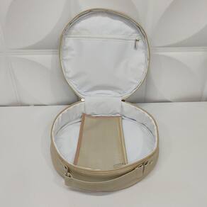 Possui 30 cm de altura x 30 cm de comprimento x 8 cm de largura. Possui dois bolsos com zíper. Compartimento principal com forração interna branca e impermeável para facilitar a limpeza. Alça de mão. Metais Niquelados.