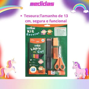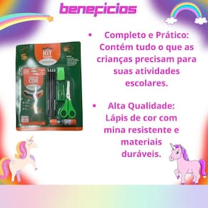 Além dos lápis de cor, o kit é complementado com itens essenciais, como lápis grafite, apontador, borracha, cola bastão e tesoura, tornando-o uma solução completa para as suas necessidades artísticas e escolares.