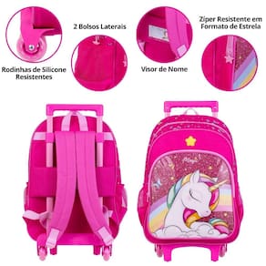 Mochila: Ideal para carregar todos os materiais com facilidade, essa bolsa vem com alças ergonômicas para as costas e um visor para o nome, garantindo que a criança possa identificar facilmente a sua mochila. Com rodinhas resistentes, é perfeita para deslizar pelos corredores da escola com estilo.