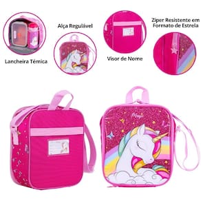 Lancheira: Perfeita para manter os lanches fresquinhos e organizados, a lancheira possui um visor para nome, além de ser superleve e fácil de carregar, garantindo que a hora do lanche seja sempre mais divertida.