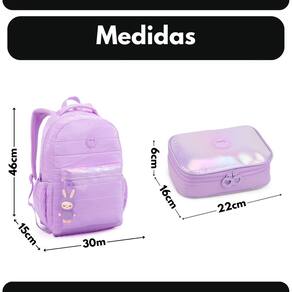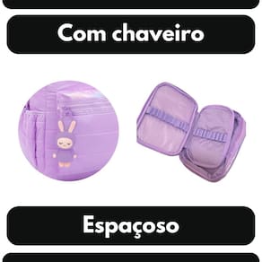 Kit Material Escolar Mochila Estojo Holográfico Chaveiro Coelhinho Lilás Fofo Kawaii Organização