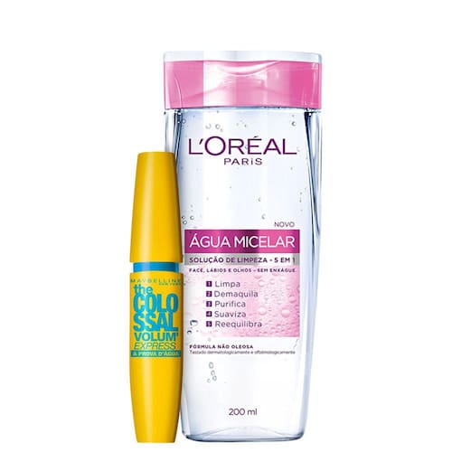 Maybelline The Colossal Volum'Express Waterproof - Máscara de Cílios 9,2ml: fórmula à prova d'água que encorpa, alonga e dá volume aos cílios sem perder o efeito ao longo do dia L'Oréal Paris Dermo Expertise Água Micelar 5 em 1 - Demaquilante 200ml: remove a maquiagem, inclusive à prova d'água, sem agredir ou deixar a pele oleosa enquanto tonifica e suaviza