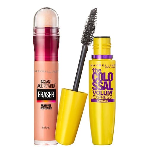Kit com máscara para cílios e corretivo líquido. Maybelline The Colossal Eraser Dark Circles 140 Honey proporciona um olhar destacado, com olheiras e linhas finas disfarçadas e cílios poderosos.