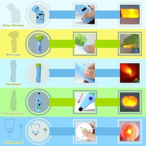 Kit médico de brinquedo para crianças desenvolverem sua imaginação, cognição e acalmarem o medo de visitar médico e dentista. FAMILIARIZADO COM O CONHECIMENTO MÉDICO O kit médico de brinquedo realista pode ajudar seu filho a entender e se familiarizar com os procedimentos médicos, como ouvir os pulmões ao tossir, abrir a boca para verificar as amígdalas, explorar a empatia e cuidar de outras pessoas. Ou fingindo brincar, o dentista limpa os dentes e o falso kit médico ensina a criança a se familiarizar com todos os aparelhos e equipamentos utilizados pelo médico. Seu pequeno médico ficará obcecado em curar qualquer paciente, e o próximo exame médico se voluntariará para cooperar com o médico! FINGE ROLE PLAY A interpretação de papéis também é uma ótima maneira de melhorar a empatia e as habilidades sociais. Seu filho usará a imaginação para criar horas de diversão com este kit de brinquedos para médicos infantis. ADORÁVEL E FÁCIL DE GUARDAR O kit médico infantil é embalado em uma maleta de transporte resistente para facilitar o armazenamento. OBSERVADO: O jaleco é de tamanho único. O kit médico Kid Doctor de 35 peças inclui uma variedade de ferramentas médicas. Pacote de brinquedos de super valor para conjunto de vestuário médico. - Com o Kit Médico LOYO, crianças em idade pré-escolar podem vestir seus jalecos brancos e mergulhar direto na diversão de dramatizar médicos. Desde verificar a pressão arterial até medir a temperatura, dar uma olhada no interior dos ouvidos e “ouvir” os batimentos cardíacos, as crianças em idade pré-escolar se divertirão muito praticando suas habilidades médicas. - O conjunto de brinquedos médicos para crianças também vem com itens essenciais realistas de cuidados dentários fingidos para limpar e tratar cáries. Como dentes fingidos, ferramentas de exame, escova de dentes, tubo de pasta de dente. Também pode incentivar seu filho a se divertir com toda essa dramatização, trocando as funções de paciente para dentista. - Kit médico lúdico de 35 peças para crianças pequenas, guarde em uma bolsa prática para facilitar a limpeza, para que aspirantes a pequenos médicos possam fazer visitas domiciliares. Inclui estetoscópio, manguito de pressão arterial, termômetro, otoscópio, seringa, bandagem, dentes fingidos, ferramentas de exame, escova de dentes, tubo de pasta de dente, traje médico e muito mais. Desenvolva às crianças o bom hábito de se organizar bem depois de brincar. - O conjunto play doctor com efeitos realistas de som e luz oferece uma forma mais divertida e envolvente de ensinar boas práticas de saúde e de aliviar os medos ou sentimentos de desconforto das crianças associados a uma visita ao dentista ou ao médico. Eles podem até ficar um pouco mais animados com a próxima visita ao pediatra. - Conheça o padrão de brinquedos ASTM dos EUA. Teste de segurança aprovado. Design com bordas lisas e arredondadas, sem pontas afiadas ou cantos, o que é seguro para crianças durante o jogo. É um ótimo presente de aniversário de brinquedo médico para meninos e meninas de 2,3,4,5,6,7 anos, para brincadeiras práticas e sem tela.