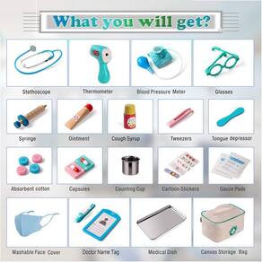 - Bolsa médica exclusiva assinável: a bolsa médica Simulation com brinquedos Doctor de 27 peças facilita o armazenamento e o transporte. Uma moldura de nome assinável torna esta bolsa médica exclusiva para seus filhos. O material de lona lavável mantém toda a atividade de dramatização limpa e higiênica. No processo, cultiva ótimos hábitos de armazenamento para as crianças.