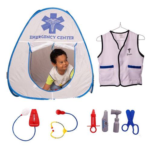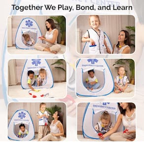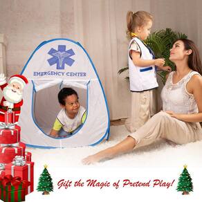 - Tenda do Centro de Emergência: Mergulhe em um RPG realista com uma tenda vibrante que transforma qualquer espaço em um centro de emergência. As crianças podem aprender empatia, trabalho em equipe e comunicação enquanto fingem tratar pacientes em um ambiente seguro e criativo com este kit médico infantil.