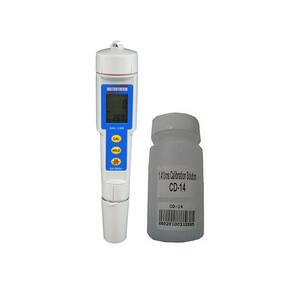 KIT MEDIDOR DE SALINIDADE DIGITAL MOD.SAL-100 + SOLUÇÃO DE CALIBRAÇÃO MOD. CD-14 1,413MS P/ MOD. CD-830/CD-840/CD-850/CD-860/CDR-870 100ML DESCRIÇÃO: Medidor de salinidade digital mod.sal-100Solução de Calibração Mod. CD-14 1,413MS p/ Mod. CD-830/CD-840/CD-850/CD-860/CDR-870 100ml ESPECIFICAÇÕES TÉCNICAS: Display: LCD duplo com indicação de temperatura e medição de salinidade Escala salinidade: 0 a 1000 mg/L Precisão: ±2 mg/L +1%F.S. Resolução: 1 mg/L Data hold: congela leitura no display Compensação de temperatura automática: 0 a 50°C (32 a 122°F) Sensor substituível Desligamento automático Escala de temperatura: 0 a 50°C (32 a 122°F) Precisão: ±0,5°C (±1°F) Umidade de operação: <80%U.R. Dimensões: 188 x 38 mm Peso: Aprox. 82gQuantidade solução: 100ml ACESSÓRIOS FORNECIDOS:Medidor de salinidade SAL-10Solução calibração CD-14 4 - baterias tipo botão (LR44)Estojo Manual de instruções