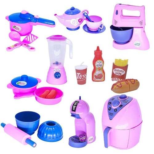 o kit vem com panelinha de pressão com talheres, panelinhas com acessório , forminhas com rolinho, air fryer, batedeira e comindinhas, liquidificador, cafeteira com cápsula de brinquedo, bulê com xícara, pires e colher
