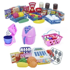 O kit mercadinho completo vem com uma caixa registradora, mercadinho completo, air fryer, batereira e cestinha com frutinhas e legumes